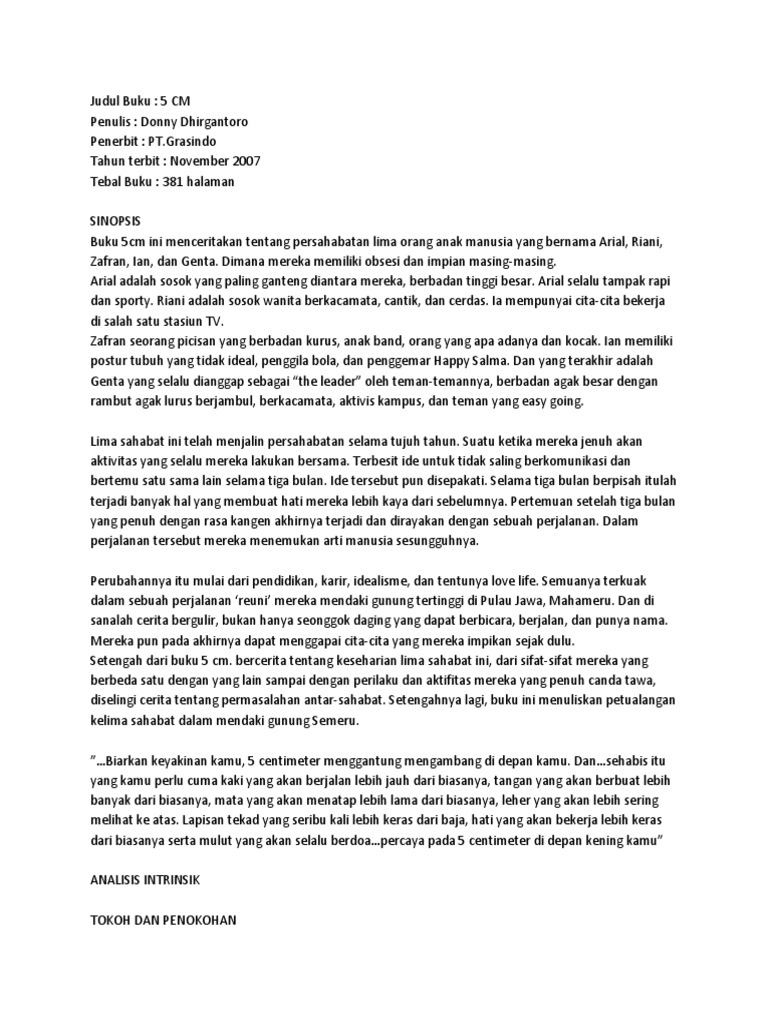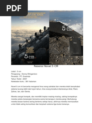 Sinopsis Resensi Novel 5 cm Novel ini berceritakan mengenai kisah 5 orang pemuda dan pemudi yang menjalin persahabatan dan memiliki kepribadian yang berbeda. 381 hlm Nomor Edisi. Banyak aral melintang dalam perjalanan mereka menuju puncak.