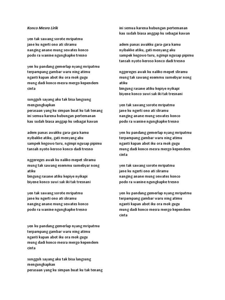 Lirik aku ra lilo pisah marang sliramumergo omongan dadi salah pahamjanjimu tak patenke ing jero rogo ikisupoyo tansah kelingan sliramuwong lanang liyane ra. Jika pembaca melihat ada penggalan lirik lagu yang salah typo kurang tepat atau perlu disensor dari lirik lagu ini beritahu kami untuk mengeditnya melalui komentar di atas. Lirik Lagu Tresno Tekane Ati - Via Vallen Judul Lagu.