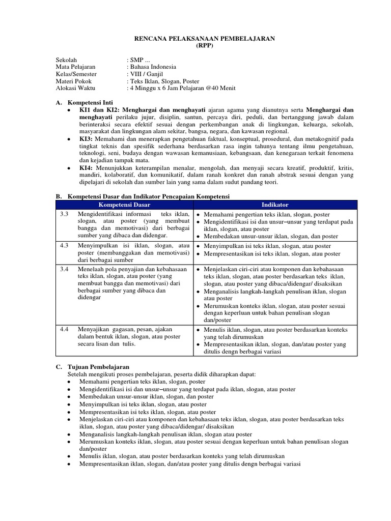 Contoh Rpp K13 Bahasa Indonesia Teks Iklan Slogan Dan Poster Terbaru Disertai Literasi Ppk 4c Dan Hots