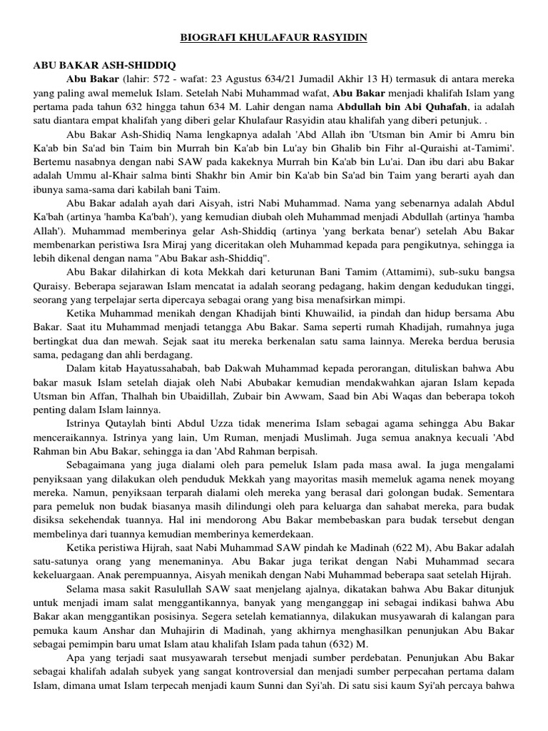 Makalah biografi khulafaur rasyidin. Khulafa berarti jama dari khalifah yang memiliki arti pengganti. V Abu Bakar Ash-Shiddiq. Sesaat setelah beliau wafat situasi di kalangan umat Islam sempat kacau.