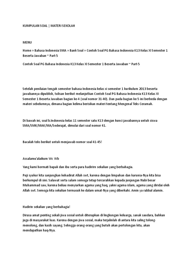 Postingan pada halaman ini akan ditambah sesuai dengan alur pembelajaran Bahasa Indonesia Kelas XI. Contoh Teks Ceramah Singkat. Berikut informasi sepenuhnya tentang contoh soal teks ceramah kelas 11 beserta jawabannya.