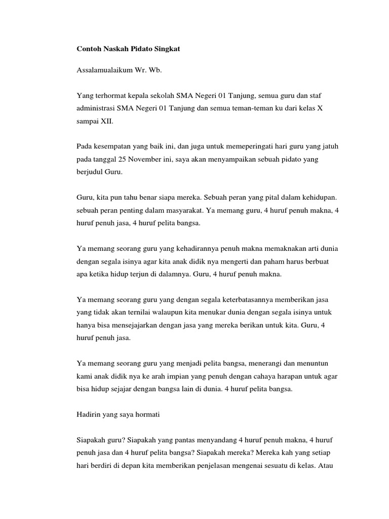 Pidato singkat pada umumnya dibawakan oleh seorang yang memberikan orasi serta pernyataan tentang suatu halperistiwa yg penting dan patut diperbincangkan. Guru nyaeta pahlawan anu mani ageung pisan jasana lamun teu aya guru urang sadaya moal tiasa naon-naon. Nah buat membantu sobat-sobat yang sedang kebingungan mencari pidato yang pendek atau singkat kali ini kami akan memberikan beberapa contoh pidato singkat yang bisa sobat gunakan.