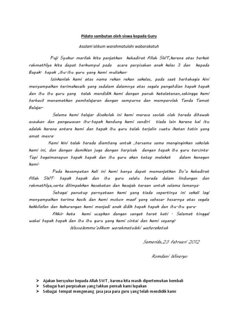 Sabar dan tabah dalam membina anak didiknya. Nah itulah pidato singkat bahasa jawa tentang perpisahan. Tentunya ketika kita sudah lulus akan ada banyak sekali hal ingin kita sampaikan kepada teman guru serta para warga sekolah lainnya.