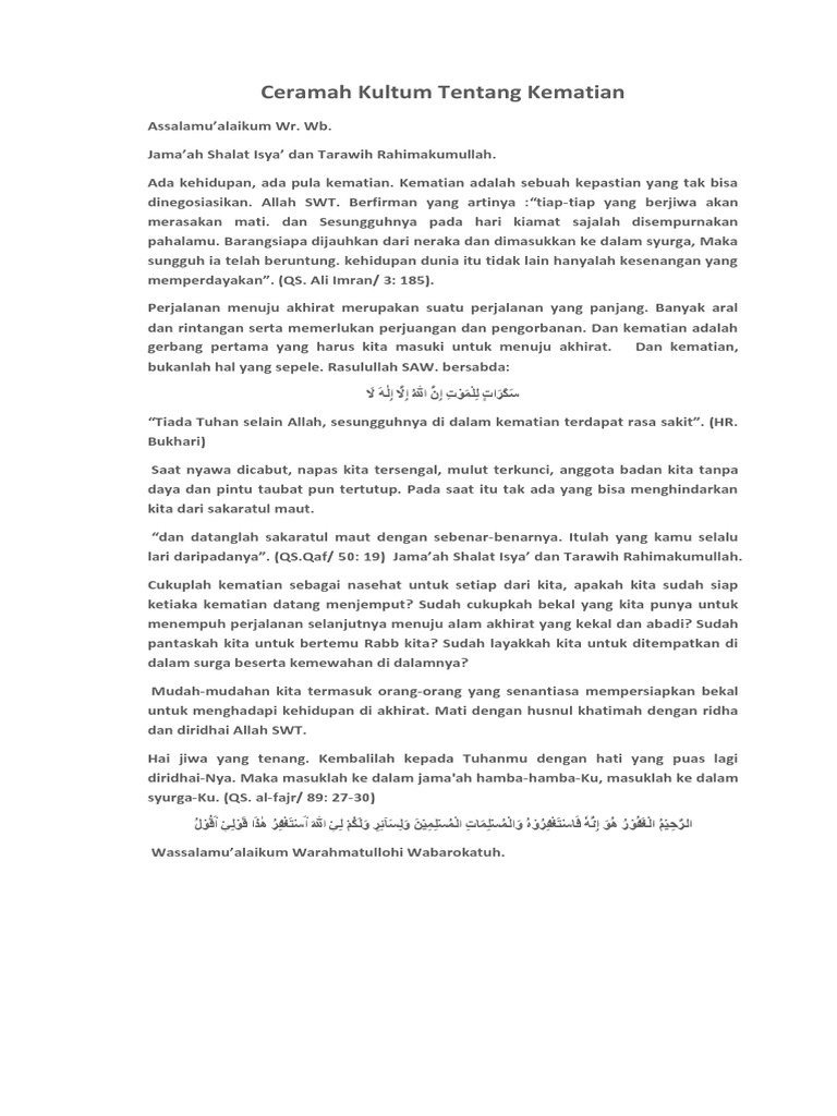Namun ada juga yang menyatakan bahwa pidato merupakan suatu aktivitas yang dilakukan untuk mengungkapkan pikiran ide maupun gagasan secara lisan. Download Teks Pidato Agama Islam Tentang Kematian PDF 1700 MB - SamPDF Unduh Teks Pidato Agama Islam Tentang Kematian PDF secara gratis di SamPDF. Teks Ceramah Tentang Kematian.