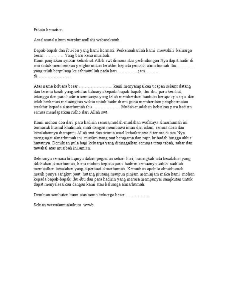 Kematian pastia akan datang kepada siapa saja kapan saja dan dimana saja. Perkenankanlah kami mewakili keluarga besar. Contoh Teks Pidato Pidato memiliki artian umum sebagai suatu kegiatan yang bertujuan untuk menyampaikan gagasan dengan menggunakan lisan pada masyarakat umum.