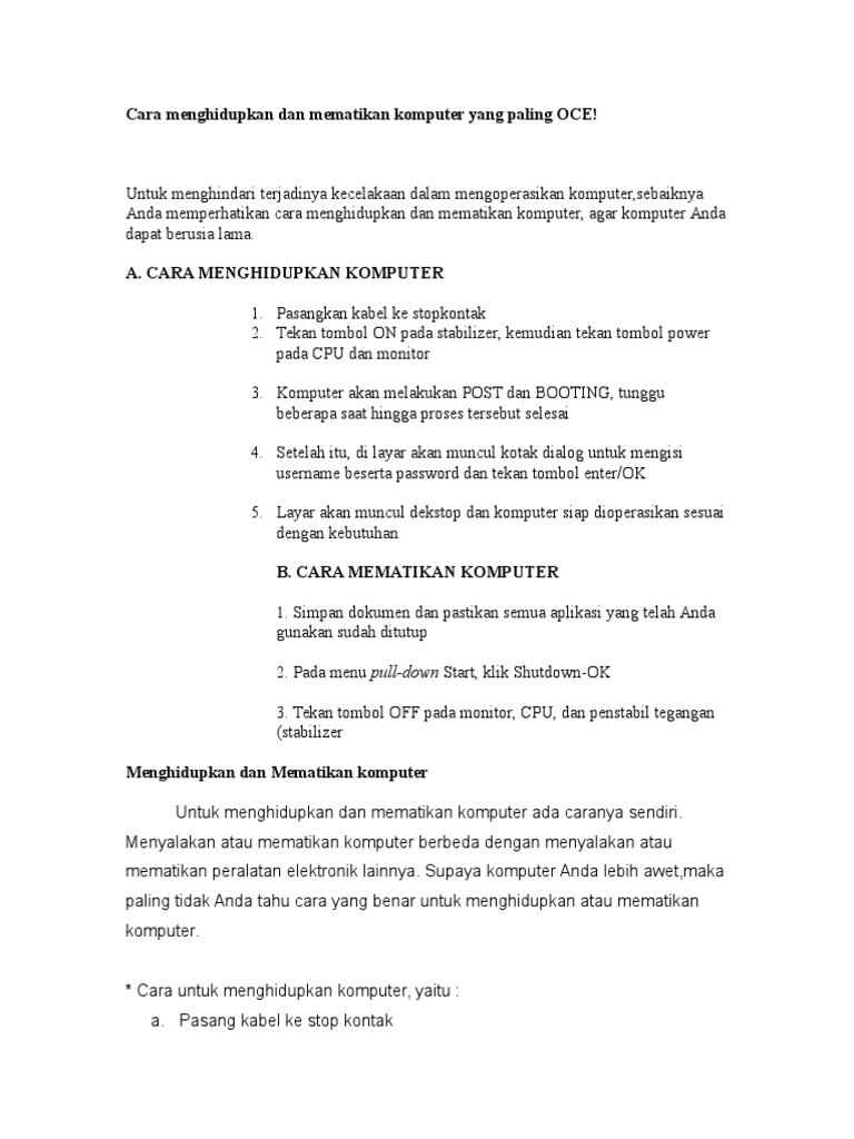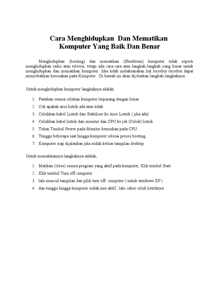 Buatlah Teks Prosedur Cara Menghidupkan Dan Mematikan Komputer Docx