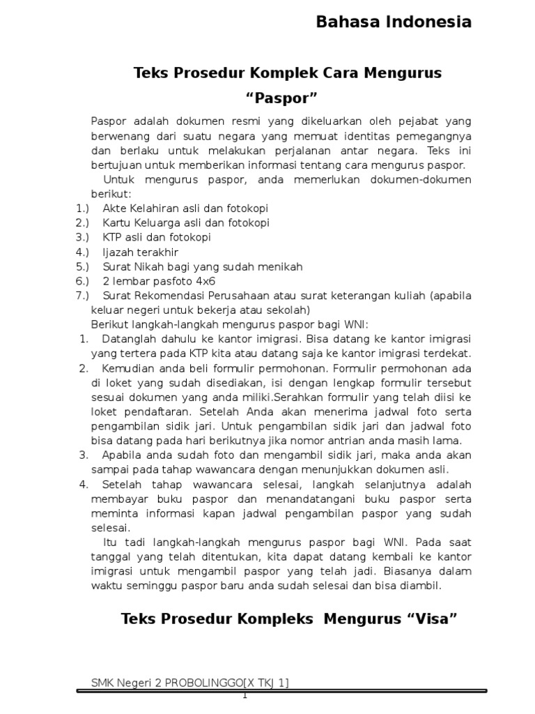 Contoh Teks Prosedur Sederhana 111 Cara membuat channel youtube 12 2. Paspor adalah dokumen resmi yang dikeluarkan oleh pejabat yang berwenang dari suatu negara yang memuat identitas pemegangnya dan berlaku untuk melakukan perjalanan antar negara. Teks prosedur kompleks adalah teks yang berisi tahap-tahap dan langkah- langkah yang harus ditempuh untuk mencapai tujuan dan terdapat keterangan yang menjadikan teks prosedur tersebut kompleks.