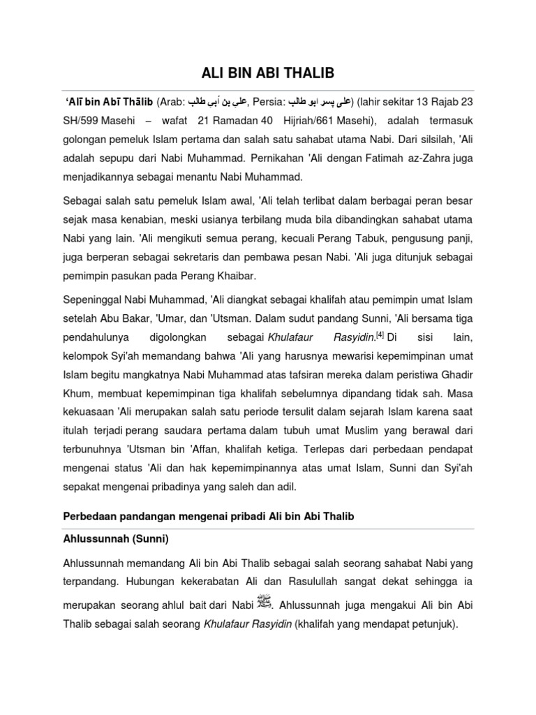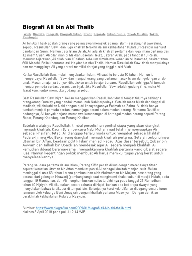 Biografi ali bin abi thalib bahasa inggris. Sekitar 624 669 adalah putra tertua Fatimah az-Zahra putri bungsu Nabi Muhammad. Ali bin Abi Thalib merupakan salah satu keluarga nabi yaitu putra dari Abi Thalib paman Rasulullah SAW. Anjeunna nyaéta salah saurang sahabat jeung tokoh anu dipikawanoh ku umat Islam digumelarkeun dina taun ka-20 saacan kanabian.
