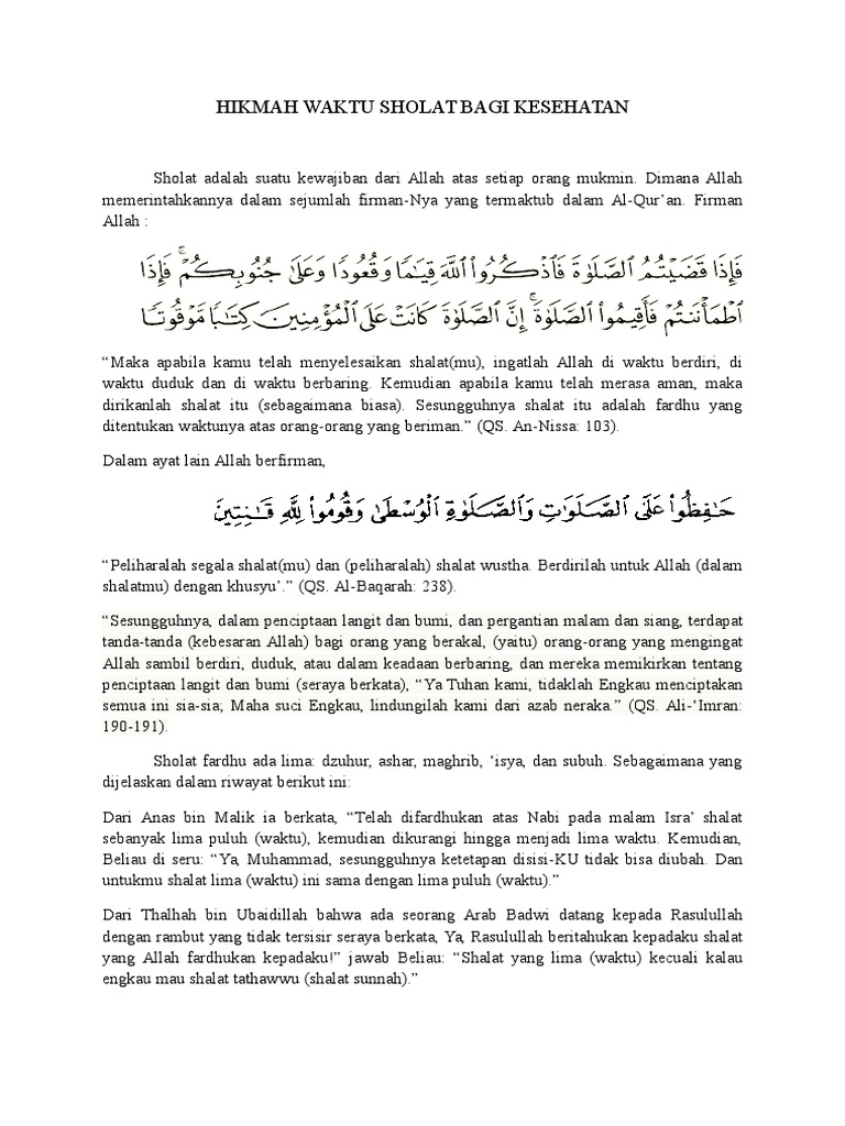 Diriwayatkan bahwa Nabi Muhammad SAW bersabda. Sesungguhnya shalat lima waktu itu telah ditentukan waktunya sesuai firman Allah dalam Surat An-Nisa ayat 103. Alhamdulillah alhamdulillahirabbilalamin wabihinastain waala umridun ya wad din wassholatu wassalamuala asrafil ambiyai wamursalin waala alihi washahbihi ajmain ama badu.