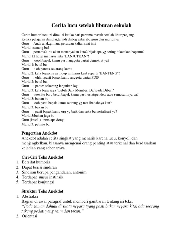 Jenis teks anekdot yang terakhir adalah anekdot dialog. Cerita Lucu Singkat Anak Sekolah Ada seorang murid SD kelas 2. Pengertian teks anekdot adalah sebuah kisah lucu dan menarik yang mungkin menggambarkan orang dan.