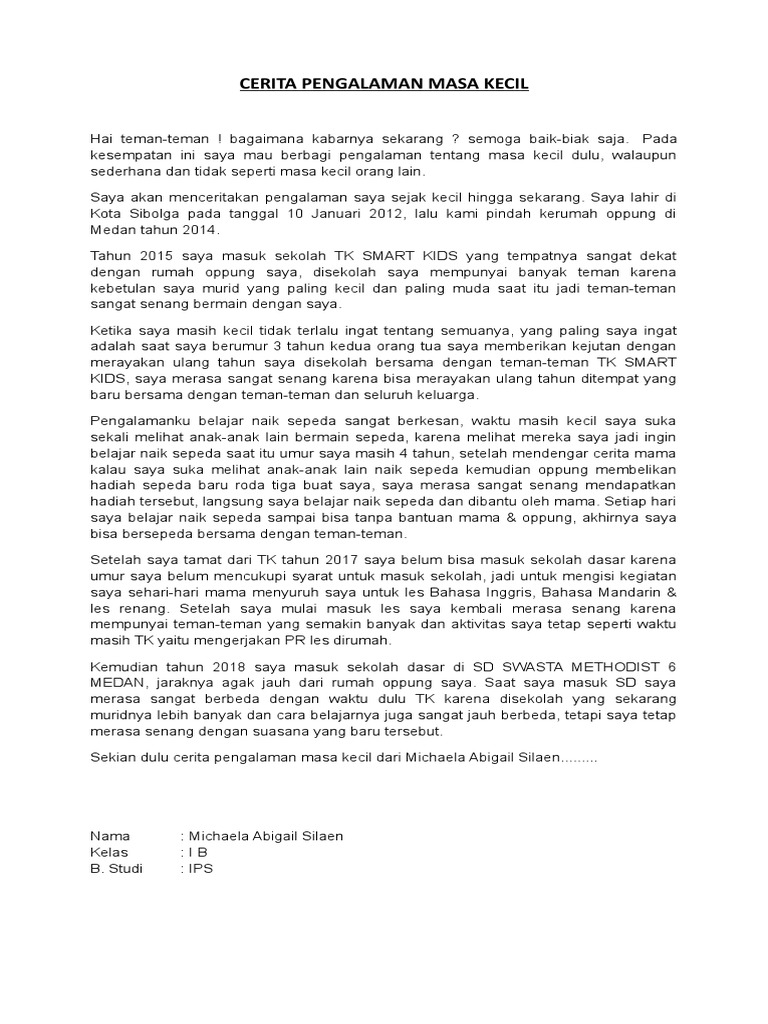 Sebenarnya saya juga bingung jika harus menulis masa kecil saya karna menurut saya tidak ada yang menarik dan semua biasa baja yang menurut saya luar biasa adalah kasih sayang dari kedua tua saya saya di besarkan oleh keluarga sederhanasay mempunyai 1 adik cowok tetapi tidak mempunyai kakak. Kenangan Masa Kecil Cerpen Karangan. Pengalaman yang paling mengesankan waktu kecil yaitu pas.