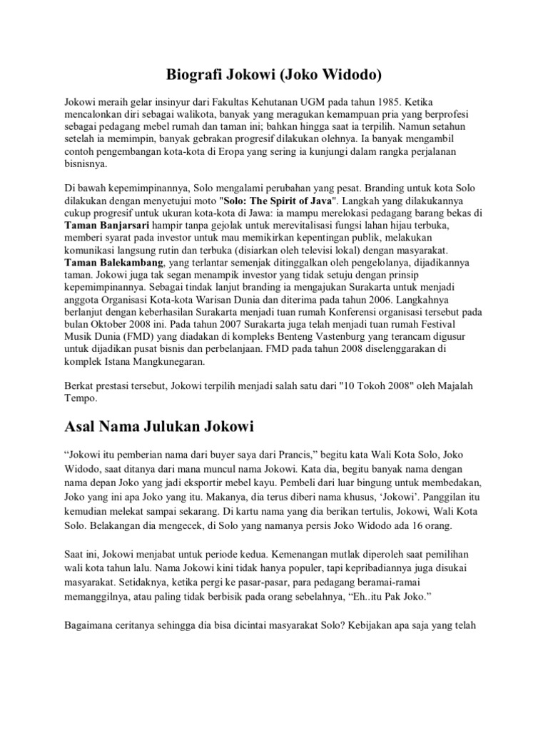 Biografi Jokowi Singkat Jokowi dilahirkan dengan nama lengkap Joko Widodo. Buku biografi pertama. Contoh Recount Text dan Biografi Jokowi Joko Widodo is also known as Jokowi.