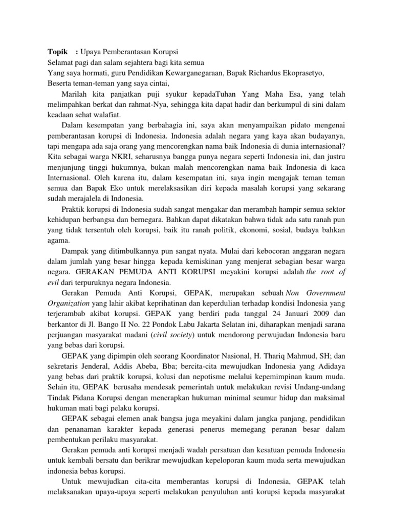 Doc Pidato Anti Korupsi Tema Dengan Memberantas Korupsi Menjadikan Bangsa Yang Makmur Oleh Pernando Kelas Xii Ips A Saut Isak Academia Edu