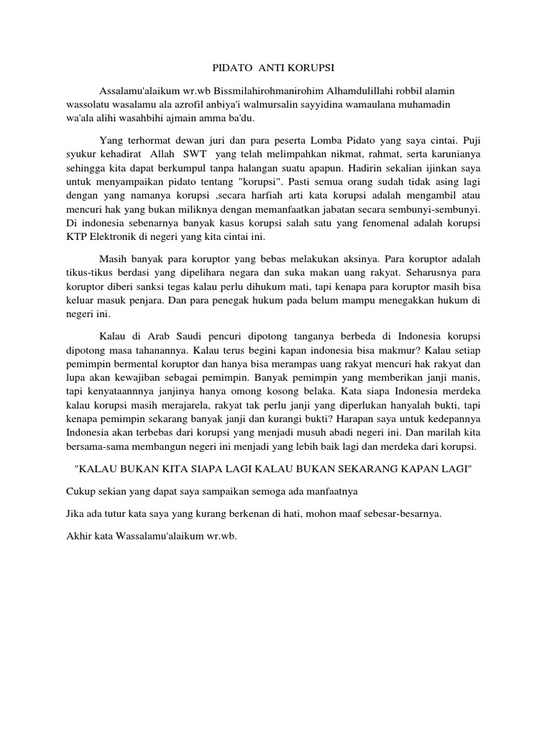 Contoh pidato anti korupsi. Usulannya tentang perlunya fiqih anti-korupsi disambut meriah seluruh peserta muktamar yang berjumlah kurang lebih 4000 orang itu. At May 25 2017. Shalawat dan salam kita sanjungkan ke haribaan junjungan besar kita nabi agung.