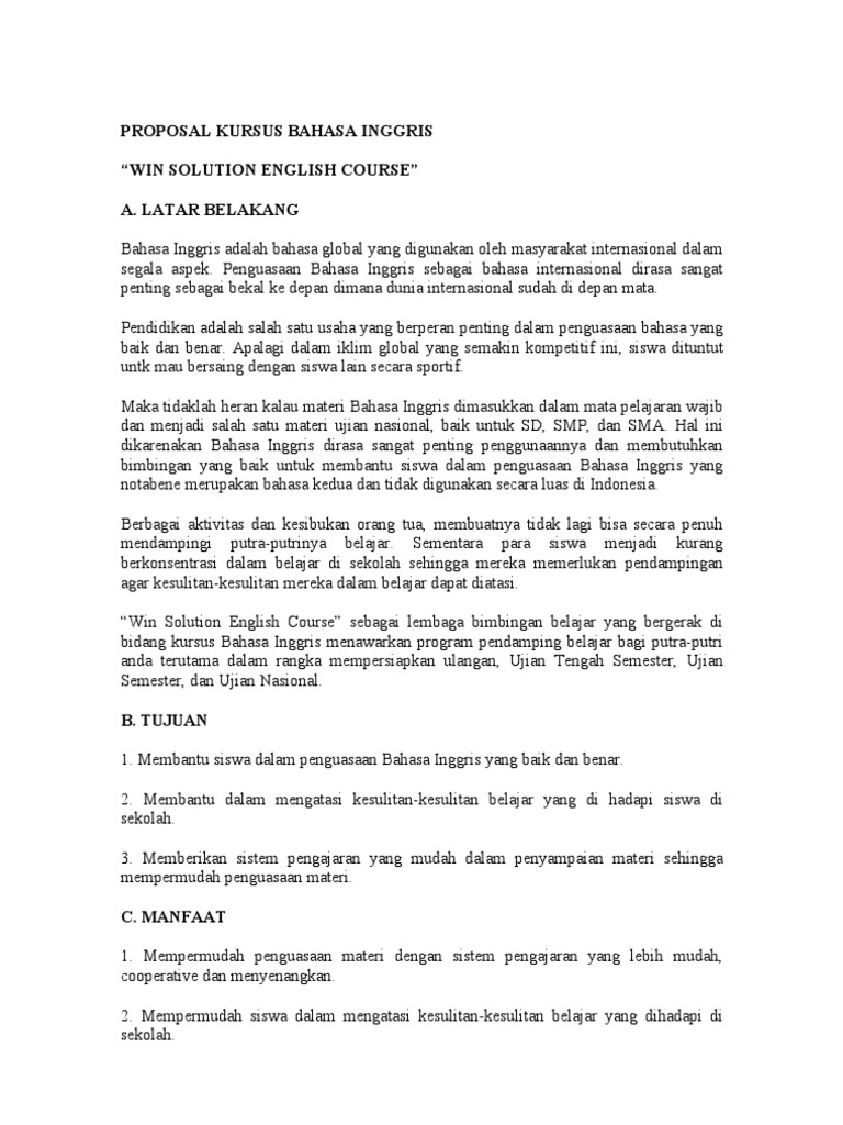 PROPOSAL KURSUS BAHASA INGGRIS WIN SOLUTION ENGLISH COURSE A. 15 Contoh Dan Cara Membuat Proposal Dana Kegiatan. Penguasaan Penguasaan Bahasa Inggris sebagai bahasa internasional dirasa sangat penting sebagai bekal ke depan dimana dunia internasional sudah di.