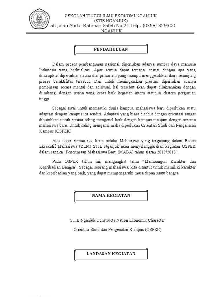 52 行 CONTOH PROPOSAL OSPEK. HIMPUNAN MAHASISWA D3 TEKNIK PERTAMBANGAN FAKULTAS TEKNIK UNIVERSITAS MULAWARMAN Sekretariatan Jalan Sambaliung No09 Gunung Kelua 75119 Gedung Sekretariat lantai 2 Fakultas Teknik Universitas Mulawarman Samarinda Kaltim. 12 Contoh Proposal Kegiatan Kampus Terbaru Yang Baik Dan Benar Apa sih proposal kegiatan itu.