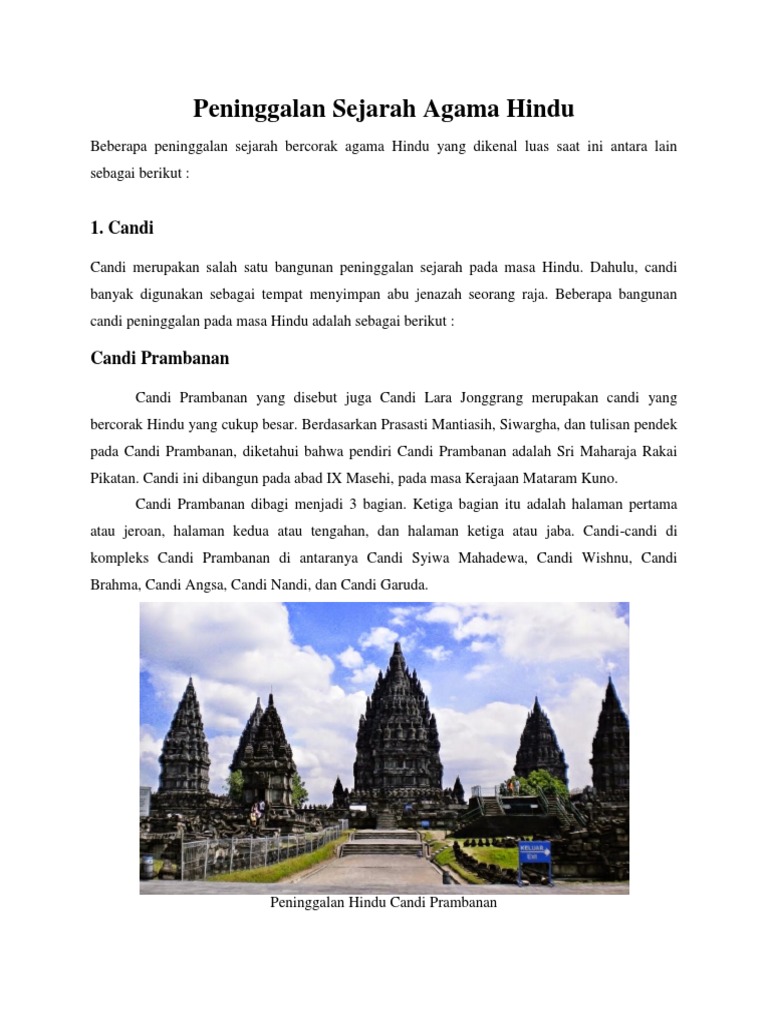 Peninggalan sejarah yang bercorak kebudayaan Hindu antara lain candi prasasti patung karya. Peninggalan Hindu Budha Di Indonesia Serta Contoh Dan Gambar Doc Dokumen Tips Kliping Peninggalan Sejarah Deeny Fauzy 13 Kerajaan Hindu Budha Di Indonesia. Dikenal juga dengan nama Candi Roro Jonggrand kompleks Candi Prambanan adalah kompleks Candi Hindu terbesar di Indonesia yang dibangun pada abad ke-9 Masehi.