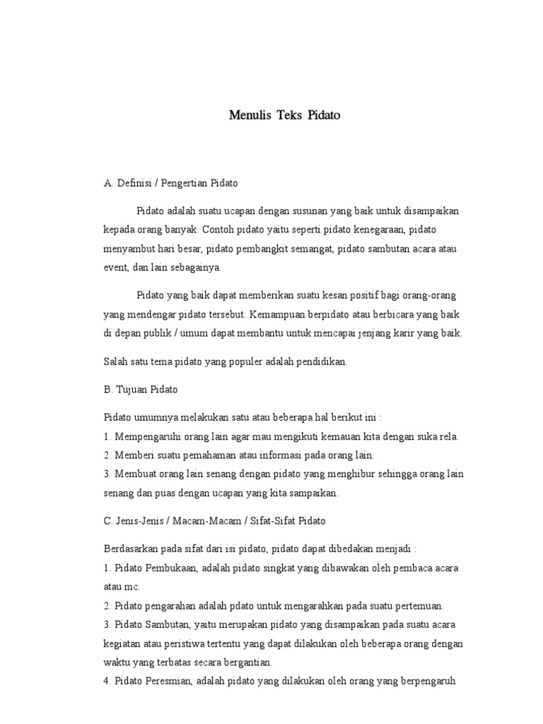 Macam-Macam Pidato Macam-macam pidato antara lain sebagai berikut ini. Pidato merupakan satu di antara teori pada pelajaran Bahasa Indonesia itu mengapa generasi muda harus menguasai teknik berpidato dengan baik dan benar. Pidato Pembukaan adalah pidato singkat yang dibawakan oleh pembaca acara atau mc.