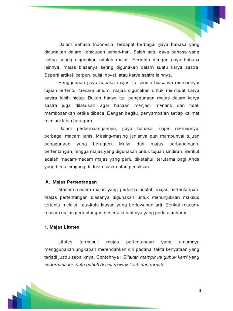 Litotes Litotes merupakan kebalikan dari Hiperbola yang lebih ke arah Perbandingan litotes merupakan salah satu Gaya Bahsaa yang isinya berupa ungkapan untuk merendahkan dirinya sendiri meskipun kenyataan yang sebenarnya justru malah sebaliknya. Berikut ini ada beberapa ciri-ciri atau karakteristik dari majas litotes diantaranya yaitu. Majas Pertentangan ini dapat dibagi menjadi beberapa subjenis yaitu sebagai berikut.