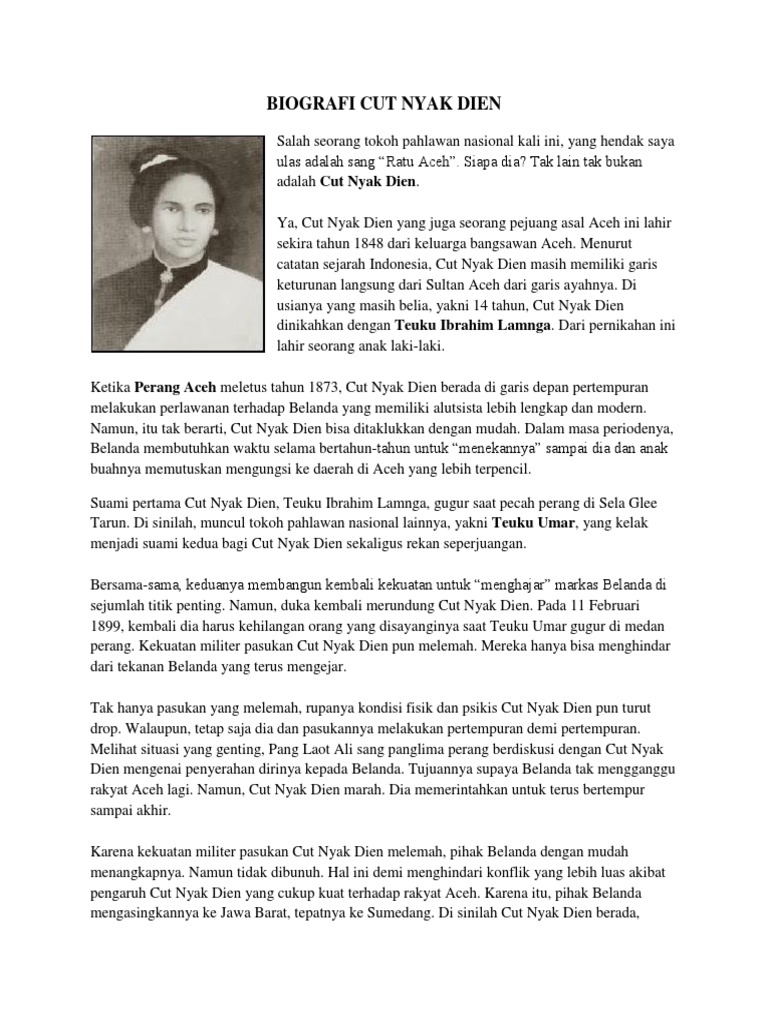 Biografi sendiri isinya menceritakan kehidupan seseorang mulai dari lahir sampai meninggalnua seperti orang atau tokoh yang diceritakan dalam biografi sudah tidak ada. Cut Nyak Dhien Lamdinang Kerajaan Aceh 1848 Sumedang Jawa Barat 6 November 1908. Biografi jenderal sudirman dalam bahasa inggris general sudirman is one of the most popular figures in the history of the struggle of the indonesian nation.