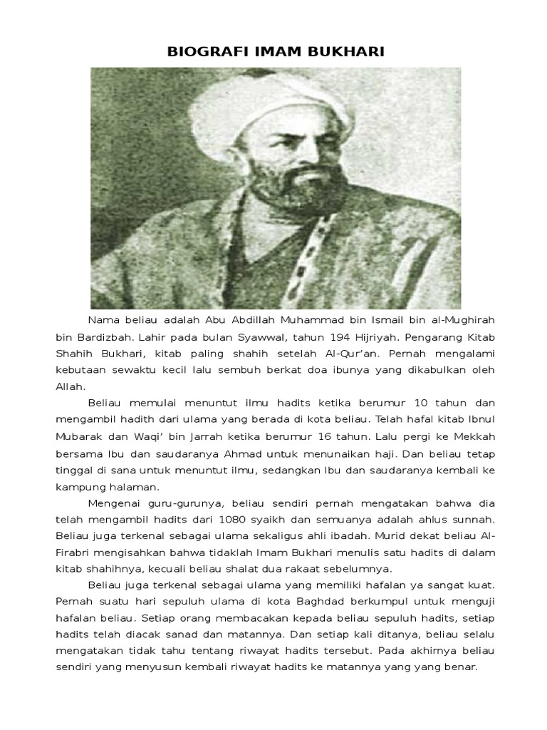 Biografi Imam Bukhari Imam Bukhari lahir dengan nama lengkap Abu Abdillah Muhammad bin Ismail bin Ibrahim bin al-Mughirah bin Bardizbah al-Jufi al-Bukhari. Biografi Imam Bukhari Biografi. Nama lengkapnya adalah Abu Abdullah Muhammad bin Ismail bin Ibrahim bin Al-Mughirah bin Badrdizbah Al-Jufiy Al Bukhari namun beliau lebih dikenal dengan nama Bukhari.