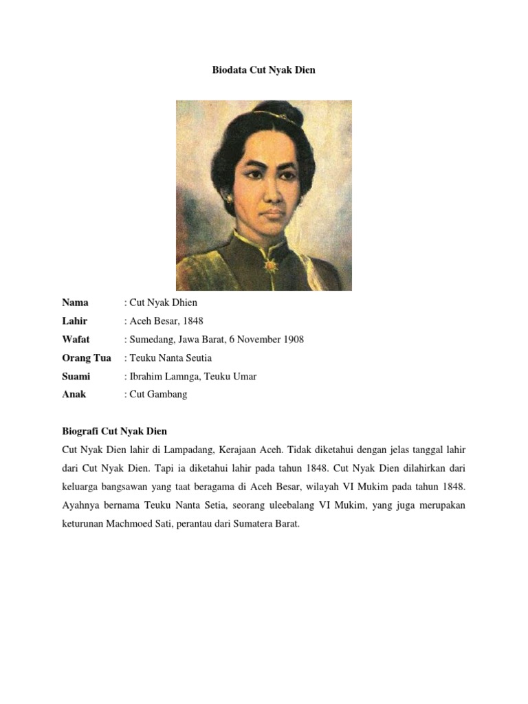 Biodata Cut Nyak Dien Docx Biodata Cut Nyak Dien Nama Cut Nyak Dhien Lahir Aceh Besar 1848 Wafat Sumedang Jawa Barat 6 November 1908 Orang Tua Teuku Course Hero
