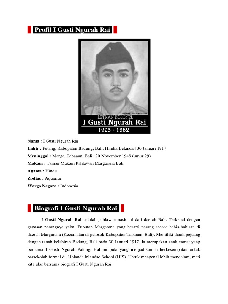 Biografi pahlawan bali. Sebab Perlawanan ini berawal dari pemerintah kolonial Hindia Belanda ingin menghapuskan hak tawan karang yang berlaku di Bali yaitu hak bagi raja-raja yang berkuasa di Bali untuk mengambil kapal yang kandas di perairannya beserta seluruh isinya. 14 September 1993 Gelar. I Gusti Ngurah Rai adalah pahlawan nasional dari daerah Bali.