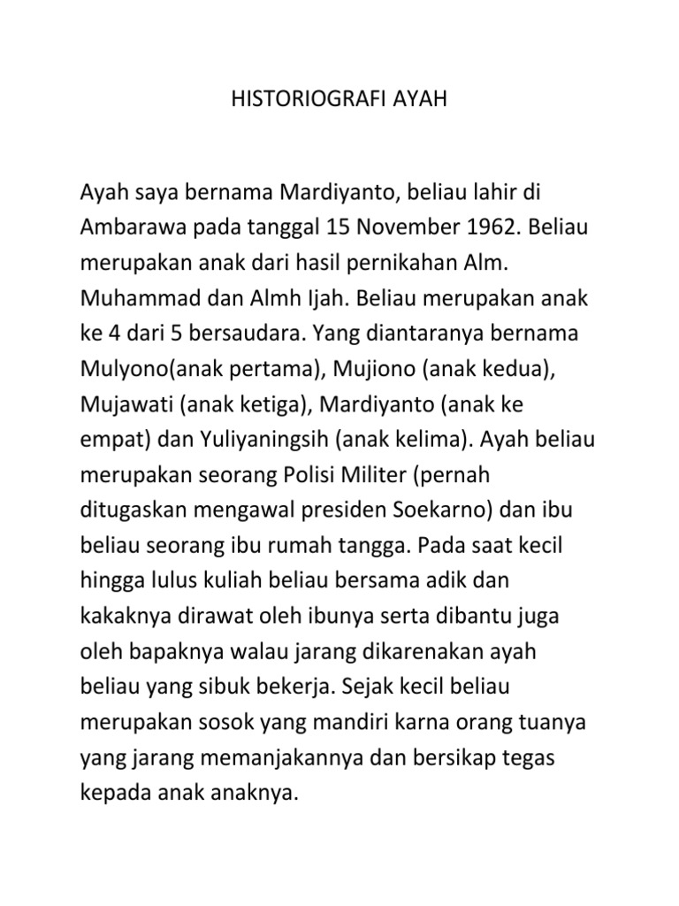 Contoh Biografi Ayah Takkan ada orang yang pemberani penyayang dan gagah selain Ayah. Materi pelatihan yang disampaikan adalah berkaitan dengan motivasi dalam lingkungan kerja yang dinamis. Nama ayah saya adalah Harnobeliau lahir di desa Cermo kecamata Kare Madiun Jawa Timur pada tanggal 10 Maret 1969.