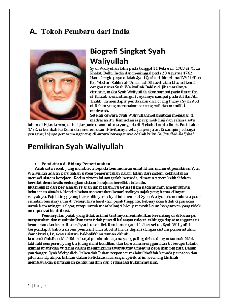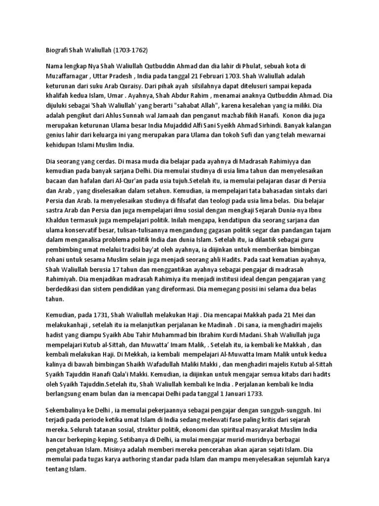 Biografi dan Ajaran Syah Waliullah Nama aslinya adalah Quthub ad Din Ahmad ibn Syah Abd Rahim bin Wajihuddin bin Muazzam bin Ahmad bin Muhammad bin Qawwamuddin pemikir ini masih memiliki garis silsilah dengan Umar Ibnu Khatab sehingga kerap kali dibelakang namanya ditambahkan dengan sebutan Al Umari Al Faruqi. Kelas XI IPA G Kelompok 1 - Achmad Reza Syauqi Ilham 01- Brian Hafizh 05- Navyansah Efendi 25. BIOGRAFI SHAH WALIYULLAH AL-DIHLAWI Nama lengkapnya adalah Qutb al-Din Ahmad bin Abd al-Rahim bin Wajih al-Din al-Syahid bin Muazam bin Mansur bin Aḥmad bin Maḥmud bin Qiwam al-Din al-Dihlawi.