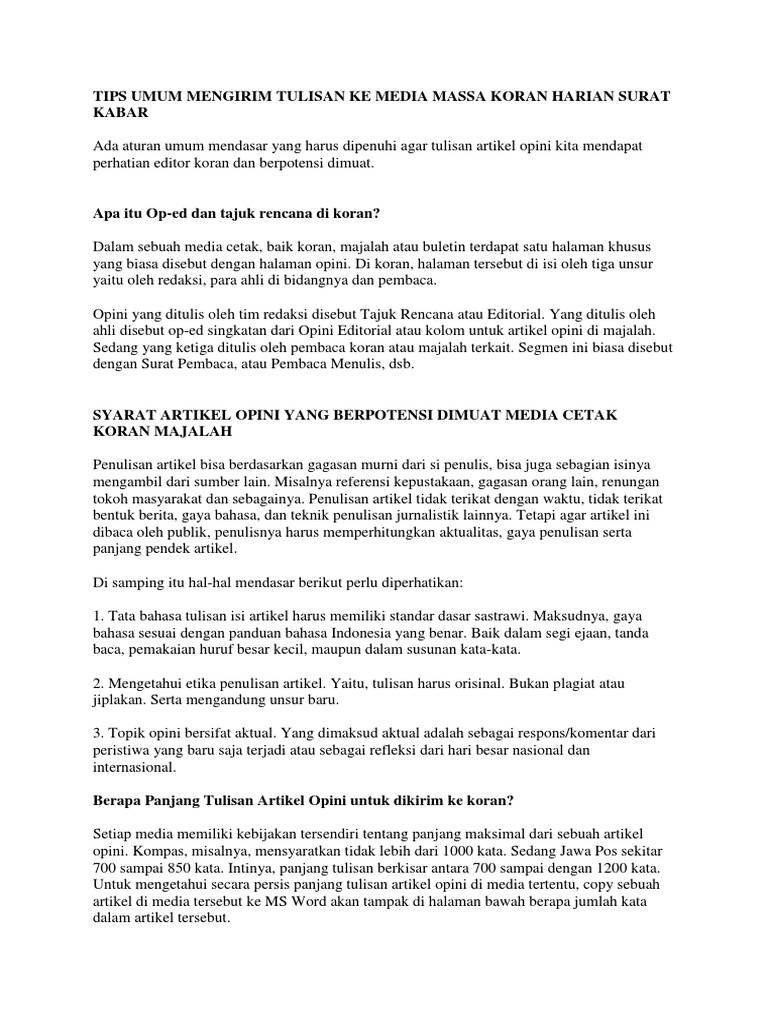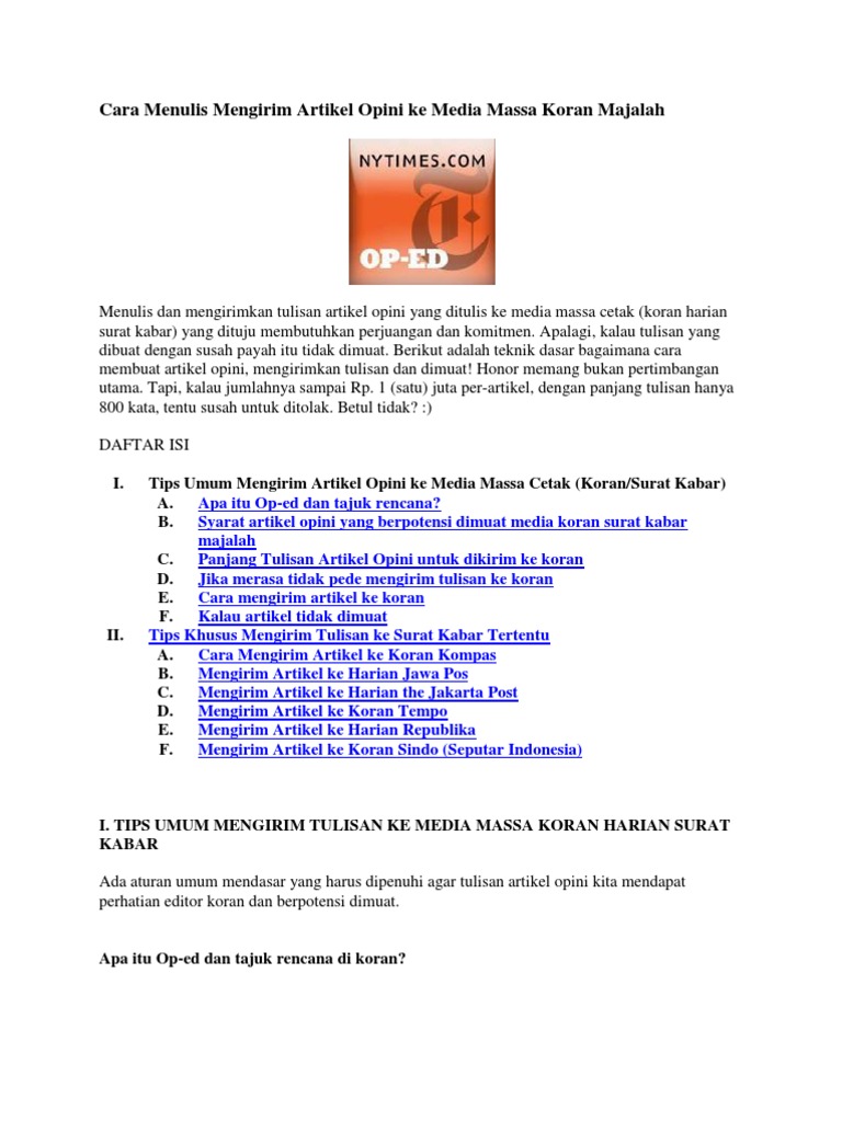 Buat kamu yang udah nggak sabar saya kasih tahu cara mengirimkannya ya. Menulis dan mengirimkan tulisan artikel opini yang ditulis ke media massa cetak koran harian surat kabar yang dituju membutuhkan perjuangan dan komitmen. Penulis KSI Al-Khoirot Diterbitkan Tuesday December 20 2011.