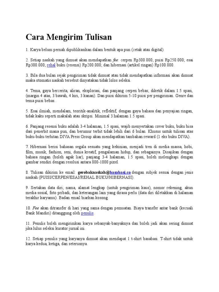 Tidak semua orang bisa menulis juga tidak semua penulis bisa menghasilkan uang dari tulisannya. Menulis dan mengirimkan tulisan artikel opini yang ditulis ke media massa cetak koran harian surat kabar. Cerpen Bobo_Judul Naskah_Nama Penulis.