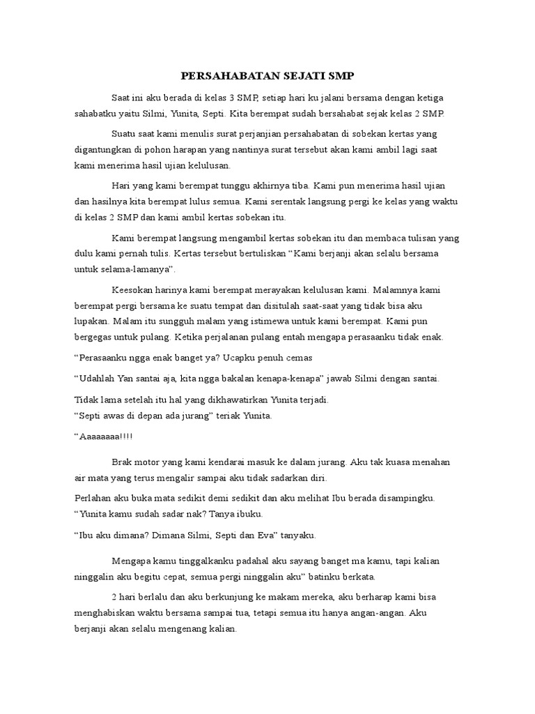 Kata malas dan bosan untuk belajar adalah kata yang tepat buat Alex siswa SMP S. Confessions of a Disquisitive Writer Baik Luar Dalam Di suatu siang yang cerah dua orang gadis bernama Rara dan Tina tengah mengerjakan tugas sekolah di rumah Rara. Cerpen Persahabatan SMP Masa yang sedang asik dalam sekolah yakni SMP jujur pada waktu SMP ini banyak kenangan dengan persahabatan kami seperti Contoh Cerpen Persahabatan ini.