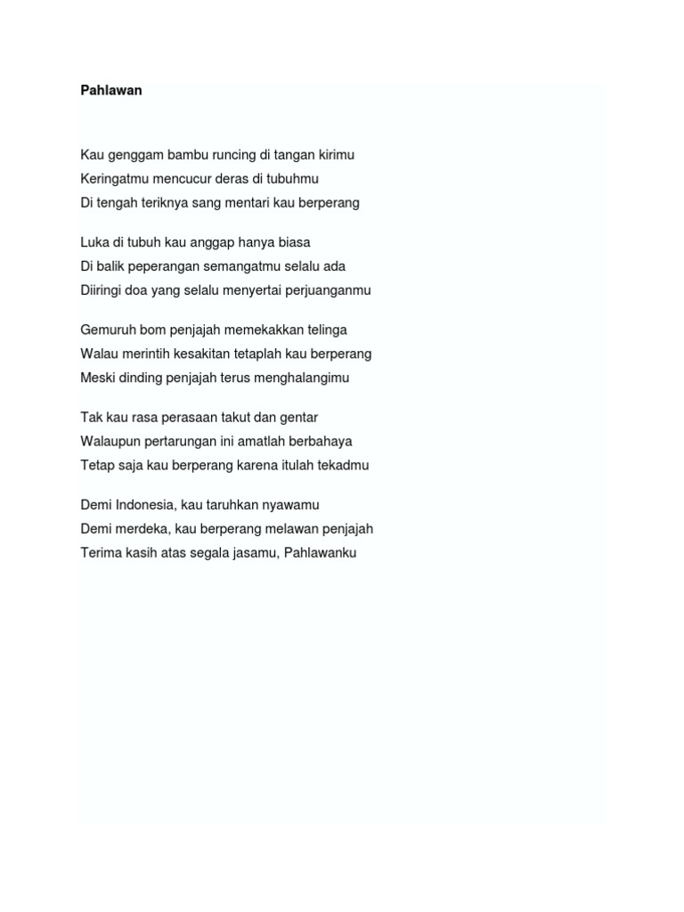 Pengorbanannya perjuangannya rasa patriotismenya serta niat dan tekad untuk meraih kemerdekaan negaranya sangatlah besar. Berikut ini adalah beberapa puisi pahlawan yang dikumpulkan dari berbagai sumber sebagai bahan renungan dan apresiasi kepada jasa besar orang-orang yang mati di medan tempur sebagai pahlawan dalam memperjuangkan kemerdekaan bangsa ini melawan penjajah. Contoh cerpen singkat contoh cerpen contoh cerpen singkat contoh cerpen lengkap contoh cerpen pendidikan contoh cerpen kehidupan contoh cerpen persahabatan contoh cerpen anak contoh cerpen beserta strukturnya contoh cerpen bertema pendidikan contoh cerpen tema sosial contoh cerpen cinta contoh.