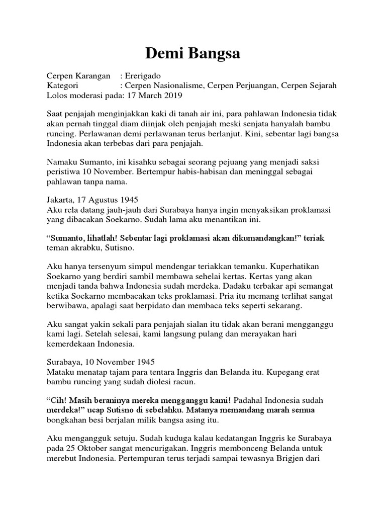 DOC Pahlawan Bangsa Novarizky Aulannisa - Academiaedu CERPEN PAHLAWAN Perjuangan Sang Pahlawan Contoh Cerpen Sejarah Pahlawan Pejuang Kemerdekaan Dendam darah revolusi restoe prawironegoro ibrahim Cerpen Aku Bangga Menjadi Anak Surabaya Cerpen - Demi Bangsa DOC cerpen jayalah bangsaku teza dwi. Kalau iya langsung aja baca deh. Mohammad Hatta memproklamasikan Tanggal 17 Agustus 1945 Ir Soekarno dan Drs.