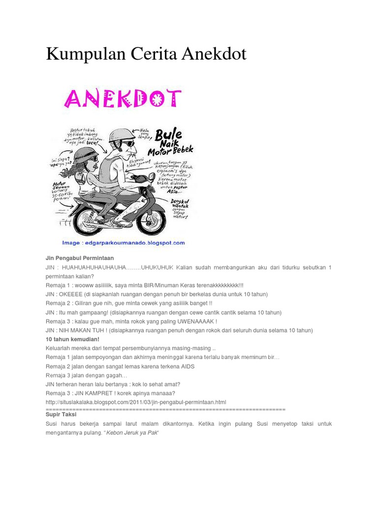 Teks anekdot merupakan cerita singkat mengenai orang penting atau terkenal yang dikemas dengan jenaka. Anekdot cerpen menceritakan suatu hal yang tidak berbelit-belit supaya pendengar atau pembaca lebih cepat mengerti isi lelucon dalam cerita tersebut. Serba serbi pengetahuan dunia memahami teks anekdot apr anekdot adalah sebuah cerita singkat yang menarik kumpulan cerpen 6 tokoh karena lucu berjenis narasi yang ralatif pendek yang mengandung kelucuan anekdot biasanya berbentuk kisah yang sangat pendek jauh lebih pendek daripada cerpen untuk melihat contoh contoh teks anekdot anda bisa klik link dibawah ini teks anekdot.