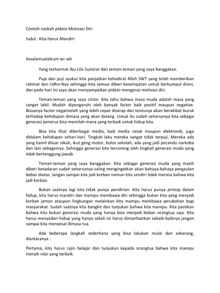 Kita Harus Mandiri Assalamualaikum wrwb Yang terhormat Ibu Lilis Sumirat dan teman-teman yang saya banggakan. Untuk lebih lengkapnya simak pidato tentang motivasi belajar semoga bermanfaat. Dan tema pidato yang akan saya sampaikan pada hari ini adalah tentang menciptakan motivasi belajar pada diri sendiri.