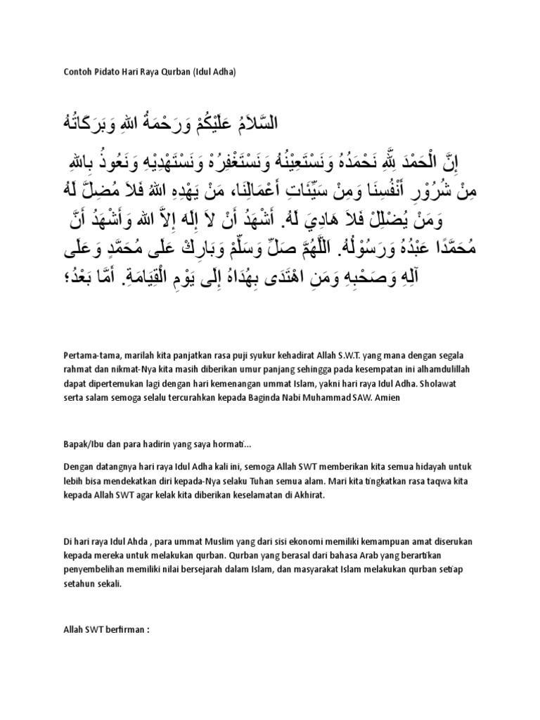 Contoh Pidato Pada Hari Raya Qurban Idul Adha Hari raya qurban atau yang biasa dikenal dengan istilah Idul Adha merupakan momen hari besar dalam agama islam dimana pada hari tersebut akan diperingati peristiwa qurban. Pidato bahasa sunda tentang qurban. Pidato singkat tentang larangan minuman keras.