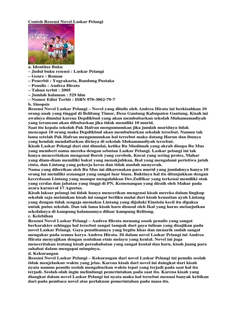 Doc Contoh Resensi Novel Laskar Pelangi Sinopsis Novel Laskar Pelangi Novel Ini Menceritakan Tentang Sepuluh Anak Belitung Yang Tergabung Dalam Laskar Annissa Ari Mukti Academia Edu