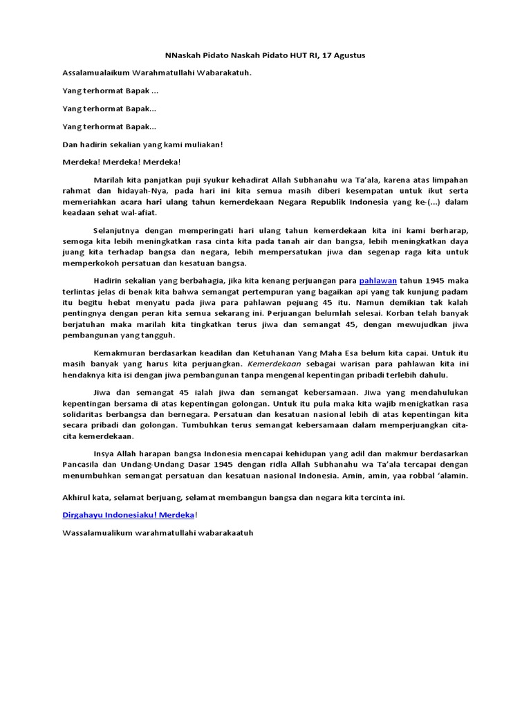 Salah satu bagian penting dalam upacara bendera peringatan HUT Kemerdekaan RI adalah pembacaan sambutan pidato. June 07 2018 Post a comment. Pada kesempatan yang bahagia dan merdeka ini satu bahasa akan memberikan naskah pidato tentang 17 Agustus.