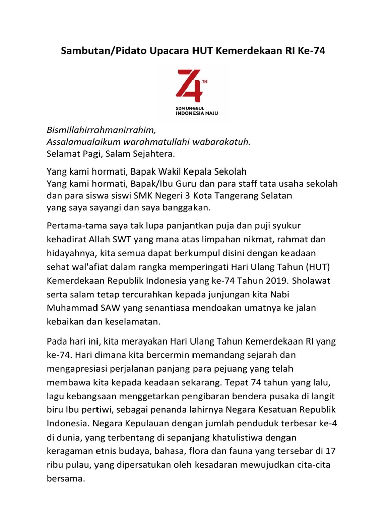 Pidato Sambutan Upacara Hut Ri Ke 74 Tahun 2019 Di Sekolah Docx