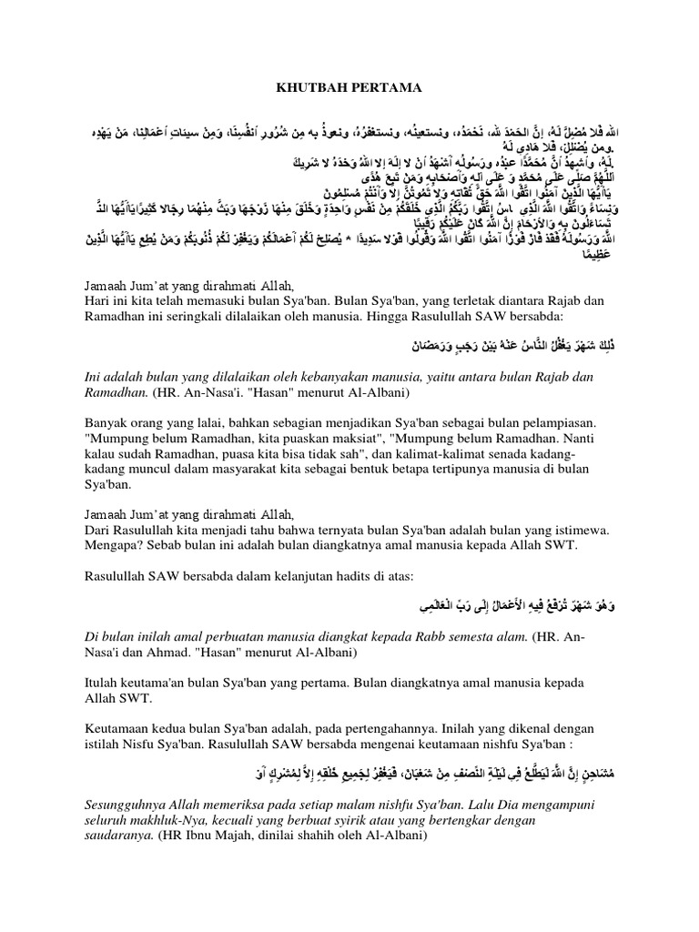 Sebuah hadits mengatakan bahwa Nabi SAW lebih sering puasa sunah di bulan Syaban dibandingkan pada bulan lainnya HR Al-Bukhari. Naskah khutbah Jumat di bawah ini mengingatkan umat Islam akan keutamaan bulan Syaban terutama di malam pertengahan bulan atau biasa disebut nisfu Syaban. Hal ini berdasarkan ketetapan Pengurus Pusat Nahdhatul Ulama PBNU.