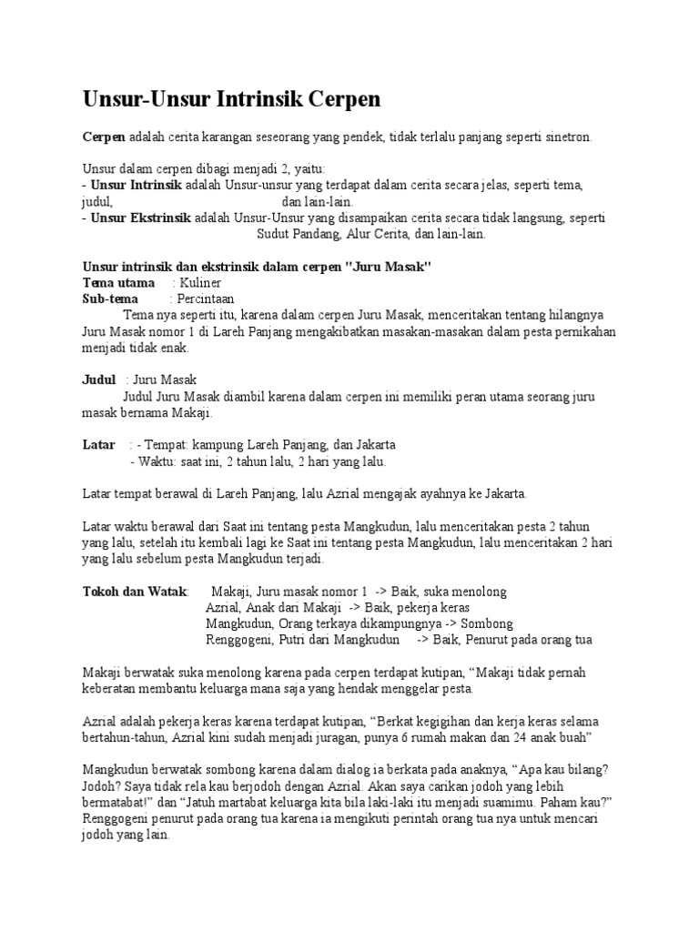 Analisis Unsur Instrinsik Cerpen Juru Masak Karya Damhuri Muhammad Brainly Co Id