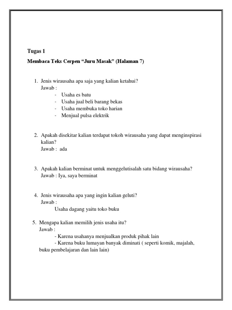 Membaca Teks Cerpen Juru Masak Tugas halaman 7 dan 11 Jenis wirausahan apa saja yang kalian ketahui. Ringkasan Teks Cerpen Juru Masak Berikut ringkasan dari cerpen Juru Masak karya Damhuri Muhammad.