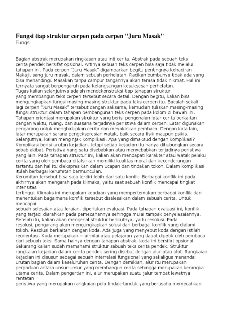 Tugas 2 Membedah Struktur Teks Cerpen Juru Masak Setelah menjawab beberapa pertanyaan yang terkait dengan teks cerita pendek tersebut kalian akan mendalami struktur teks cerita pendek. Tugas 1 Guru meminta siswa membaca teks cerita pendek Juru Masak. Membaca Teks Cerpen Juru Masak Bacalah cerpen berjudul Juru Masak karya Damhuri Muhammad berikut ini.