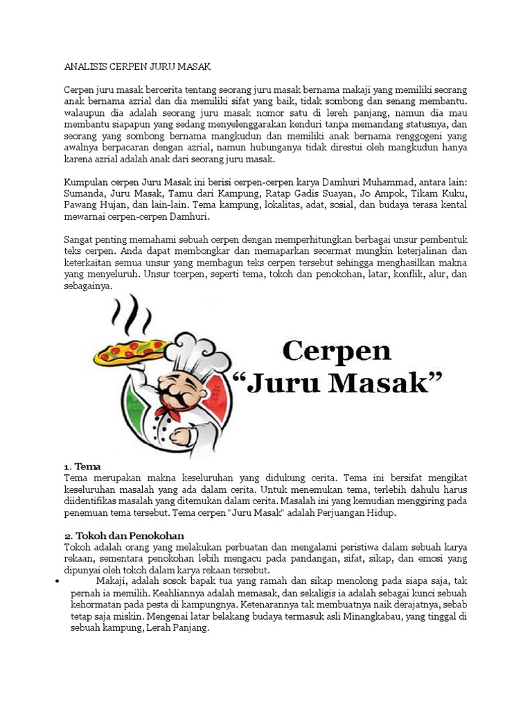 CERPEN PENDEK Posted. Tugas I Membaca Teks Cerpen Juru Masak Bacalah cerpen berjudul Juru Masak karya Damhuri Muhammad berikut ini. Tugas 1 Guru meminta siswa membaca teks cerita pendek Juru Masak.